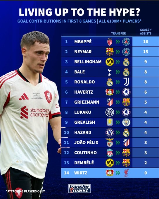 维尔茨今夏以创纪录的转会费从勒沃库森加盟利物浦,然而在新赛季的表现却未能达到预期。德转网站对转会费超过一亿欧元的攻击手们在新球队前八场比赛中的进球与助攻总和进行了统计,结果显示,姆巴佩、内马尔和贝林厄姆分别位列前茅,而维尔茨则并不在这个榜单的强者之列。